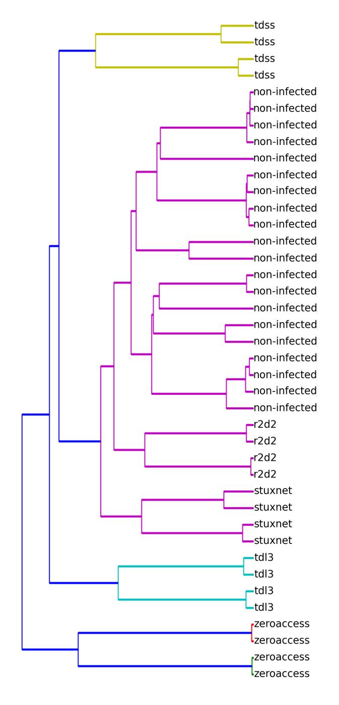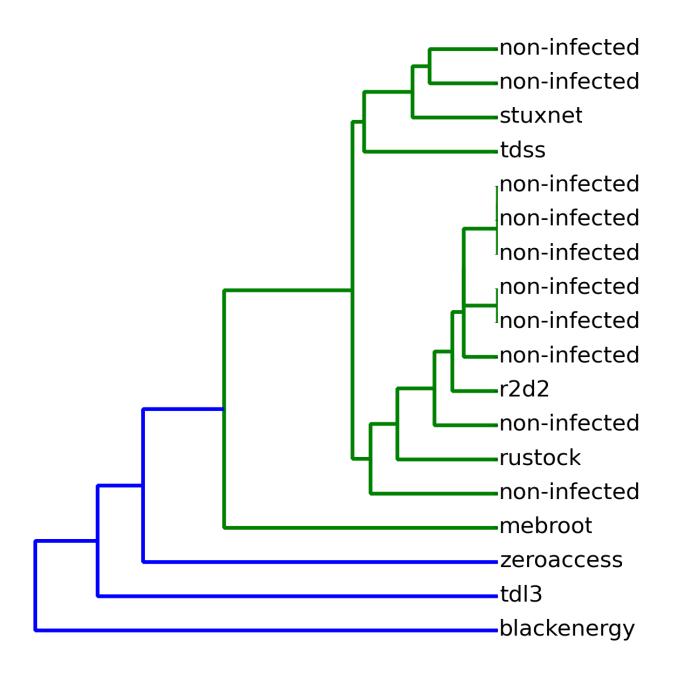 Blacksheep was also tested in detecting rootkits on Windows XP. Again, 10 clean dumps were clustered, this time together with 8 rootkits. The hierarchical clustering results are shown in Figure 3, and resulting clusters are shown in Table 2. Again, all clusters of size one were tagged as malicious.