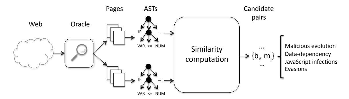 A high-level overview of Revolveris presented in Figure 3. First, we leverage an existing drive-by-download detection tool (an "Oracle") to collect datasets of both benign and malicious web pages (§3.1). Second, Revolver extracts the ASTs (§3.2) of the JavaScript code contained in these pages and, leveraging the Oracle's classification for the code that contains them, marks them as either benign or malicious. Third, Revolver computes a similarity score for each pair of ASTs, where one AST is malicious and the other one can be either benign or malicious (§3.3–§3.4). Finally, pairs that are found to have a similarity score higher than a given threshold are further analyzed to identify and classify their similarities (§3.5).