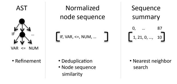 To address this problem, we introduce the idea of sequence summaries. A sequence summary is a compact summarization of a regular normalized node sequence, which stores the number of times each node type appears in the corresponding AST. Since there are 88 distinct node types, each node sequence is mapped into a point in an 88-dimensional Euclidean space. An advantage of sequence summaries is that they bound the length of the objects that will be compared (from potentially very large node sequences, corresponding to large ASTs, down to more manageable vectors