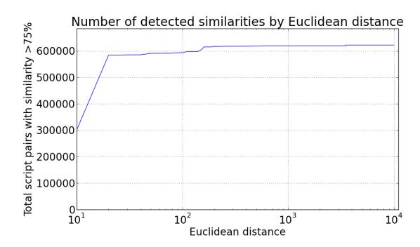 Deduplication. As a first step to reduce the number of similarity computations, we discard duplicates in our dataset of normalized node sequences. Since we use a canonical representation for the ASTs, we can easily and efficiently compute hashes of each sequence, which enables us to quickly identify groups of identical node sequences. In the remaining processing phases, we only need to consider one member of a group of identical node sequences (rather than all of its elements). Notice that identical normalized node sequences may correspond to different scripts, and may also have a different detection classification (we describe such cases in §3.5). Therefore, throughout this processing, we always maintain the association between node sequences and the scripts they correspond to, and whether they have been classified as malicious or benign.
