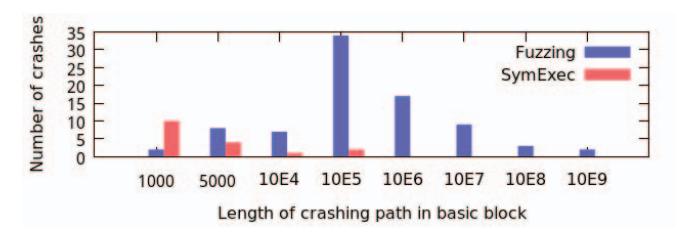 Fig. 1. Length of crashing paths discovered by fuzzing vs. dynamic symbolic execution.