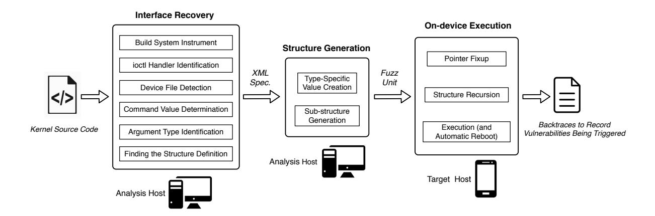 Automated driver analysis. We developed a fuzzing framework, that can automatically analyze the kernel sources of a device. For every driver the tool identifies all the ioctl entry points, as well as the corresponding structures, and device file names. We apply our technique to analyze seven devices, identifying 36 vulnerabilities. These vulnerabilities, ranging from DoS to code execution flaws, demonstrate the efficacy and impact of our approach. We are in the process of responsibly disclosing these vulnerabilities to the respective driver vendors.