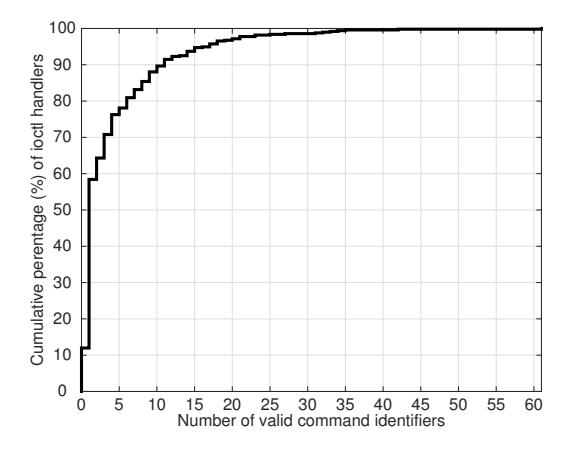 The extraction of valid ioctl commands was previously attempted by Stanislas, et al., but the state-of-the-art system was unable to scale to real-world kernel modules [38]. Conversely, as we show in Section 8, DIFUZE scales to (and finds vulnerabilities in) large kernel modules on real devices.