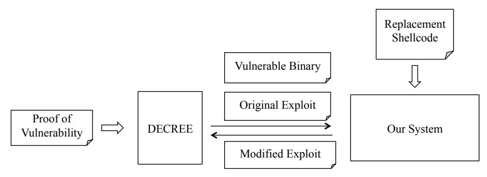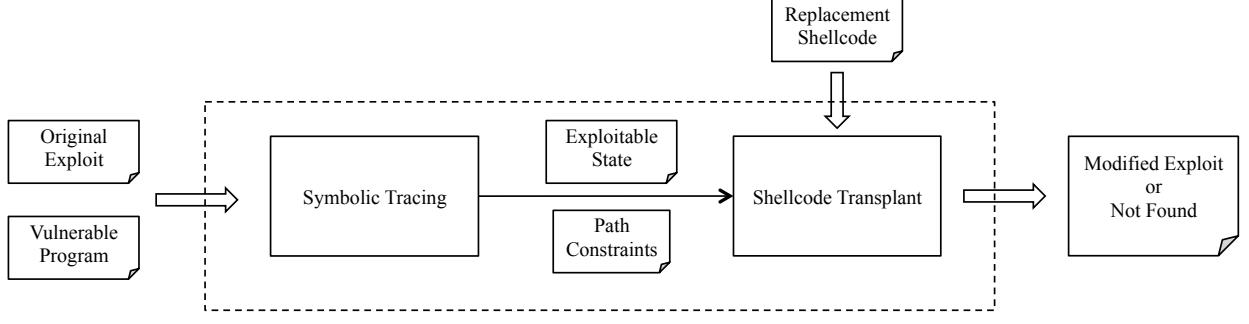 path constraints, and the replacement shellcode as input, and outputs a modified exploit that takes advantage of the vulnerability and executes the replacement shellcode. After this step, the system will output either the modified exploit or an error indicating that a modified exploit could not be found.