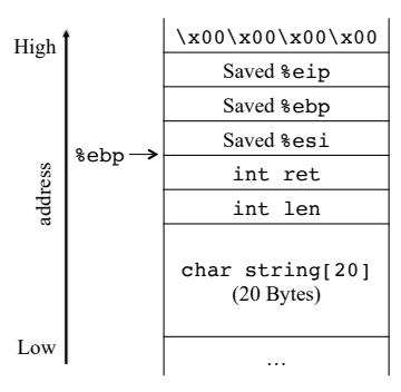 This program has a control-flow hijacking vulnerability in the processing of the received input. The string variable is a 20 byte buffer defined at line 3. However, the string received from user input can have up to 50 characters, which will overflow the buffer string and eventually overwrite the return address stored on the stack if the provided string is long enough. Figure 2 shows the stack layout of the example function. The saved return address (shown as saved %eip) is 36 bytes above the beginning of buffer string. This implies that if the received input has more than 36 characters, the input will overwrite the saved return address and change the control flow of the program when function example returns.