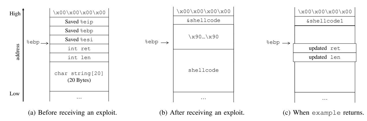 However, the modified exploit will not work when applied to our motivating example. Figure 3a shows the stack layout before function example starts. Besides saved registers, there are two variables between string and the saved %eip. When the program receives an input, the resulting stack layout is shown in Figure 3b. However, control is not immediately transferred to the shellcode. The program continues, and because variable len is updated before returning, the value at this address changes. By the time the function transfers control flow to the shellcode, the program changes the 20th through the 28th bytes of the replacement shellcode, as shown in Figure 3c. In our example, this represents unexpected modification to the replacement shellcode, rendering it nonfunctional.