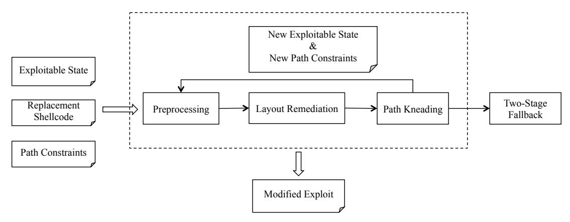 Previous work in the field of automated exploit generation generates exploits by constraining the memory bytes in each attacker-controlled buffer to the target shellcode. They enumerate all possible offsets in every attacker-controlled buffer until a solution is found [12, 17]. Such methods are insufficient. In the worst case, when attempting to compensate for the case of conflicting constraints on the replacement shellcode, these methods degenerate to a symbolic exploration of the program, which generally ends in a path explosion problem or is hampered by the inability of the symbolic execution engine to efficiently reverse complex data transformations. In fact, as we show in our evaluation, less than a third of the original exploits in our dataset can be modified by existing techniques.