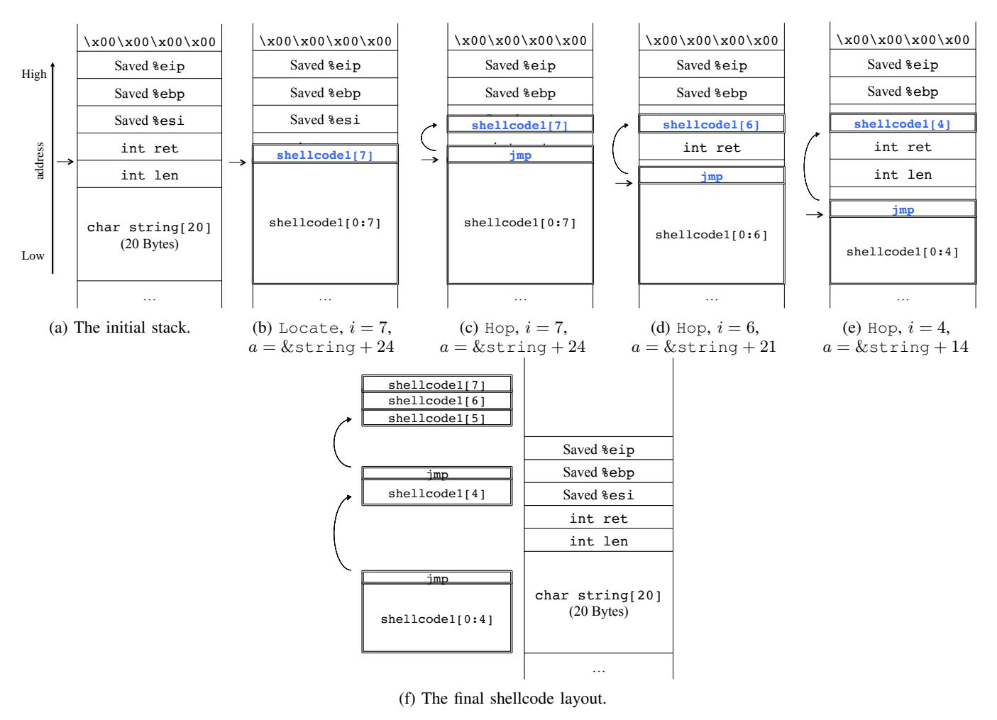 3) Surmounting the challenges: The intelligent reader can certainly envision approaches to achieve shellcode transplanting in the motivating example. However, this example is just 12 lines of code. One can see that, with bigger examples and in the general case, these challenges can be quite complicated to surmount.