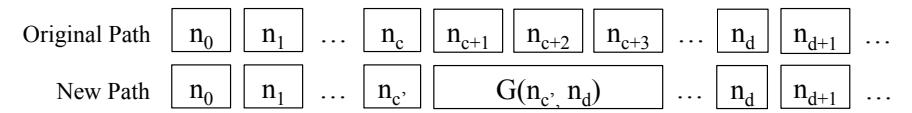Our intuition for solving the shellcode transplant problem comes from the observation that a successful control flow hijacking exploit consists of two phases: before the hijack, where the program state is carefully set up to enable the hijack, and after the hijack, when injected shellcode carries out attacker-specified actions. We call the program state after the first phase the exploitable state, and we call the instruction sequence that the program executes until the exploitable state the exploit path. An input that makes the program execute the same path as the original exploit does will lead the program to an exploitable state. Therefore, if we find an input that executes the instructions of the original exploit path in the first phase and the new shellcode in the second phase, that input represents the modified exploit.