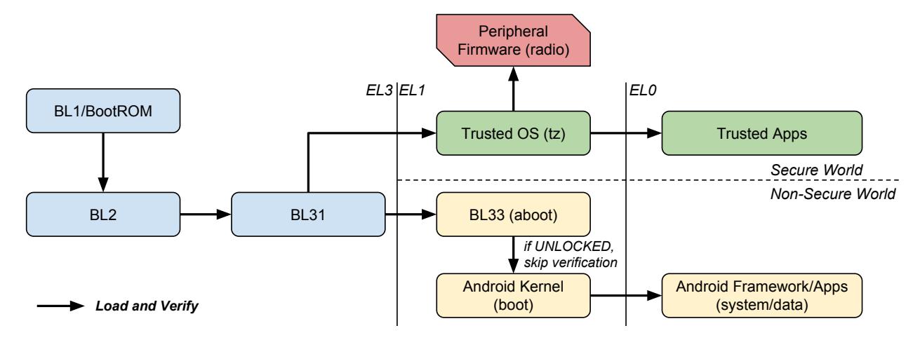 aboot is based on the Little Kernel (LK) open-source project, and provides the final stage non-secure OS loading functionality (equivalent to BL33 in ARM's reference implementation). In further similarity to BL33, it runs at EL1, giving it the same level of privilege as the kernel it aims to load. It conforms very closely to Google's Verified Boot guidelines, implementing the traditional set of Android-specific features, including Fastboot, recovery partition support, and unlocking. aboot can be used in either a Class A or Class B Verified Boot implementation, as Fastboot, and therefore unlocking can be disabled by the OEM or mobile carrier.