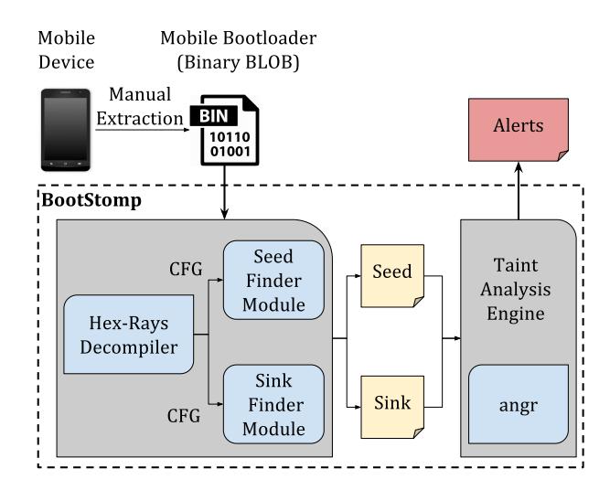 Then, we present a static analysis approach, implemented in a tool called BOOTSTOMP, which uses a novel combination of static analysis techniques and underconstrained symbolic execution to build a multi-tag taint analysis capable of identifying bootloader vulnerabilities. Our tool highlighted 36 potentially dangerous paths, and, for 38.3% of them, we found actual vulnerabilities. In particular, we were able to identify six previouslyunknown vulnerabilities (five of them already confirmed by the vendors), as well as rediscover one that had been previously-reported (CVE-2014-9798). Some of these vulnerabilities would allow an adversary with root privileges on the Android OS to execute arbitrary code as part of the bootloader. This compromises the entire chain of trust, enabling malicious capabilities such as access to the code and storage normally restricted to TrustZone, and to perform permanent denial-of-service attacks (i.e., device bricking). Our tool also identified two bootloaders that can be unlocked by an attacker with root privileges on the OS.