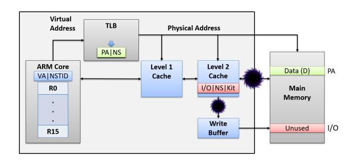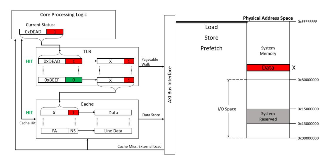 As mentioned in Section 2, all addresses are tagged with an additional NS bit to indicate what mode the entry belongs to. Normal World is only able to access entries tagged with an NS bit equal to 1. Therefore, when we load the data into the cache we have to ensure that it is tagged with NS = 1 so that Normal World will have a cache hit when it tries to do a look-up in the TLB. Figure 3 shows how the memory system of a theoretical ARM processor might handle the state associated with Security Extensions when accessing the memory system [2].
