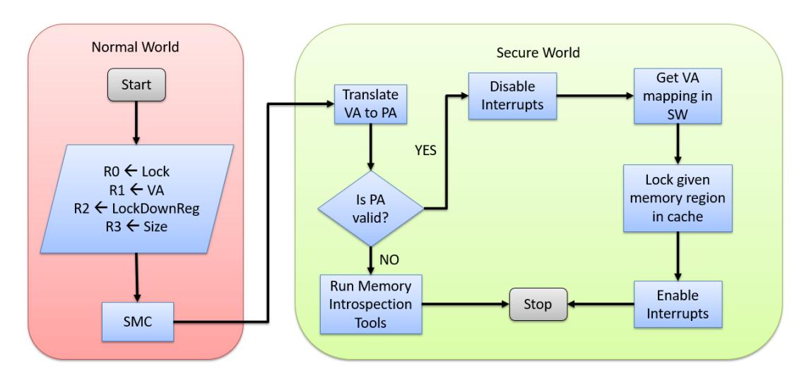 Once we have established the necessary parameters to pass to Secure World, we can detail the necessary work-flow, or steps, of the approach as shown in Figure 2. Secure World has all the necessary information to first verify that the request to lock memory is valid by ensuring only memory regions allocated to Normal World are being requested. Furthermore, all the data must first be loaded into main memory by the Normal World, and is therefore available to inspection, should Secure World find an invalid PA is given. Otherwise, it can then go through the process of servicing legitimate