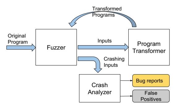 Crash Analyzer: For crashing inputs found against the transformed programs, the Crash Analyzer filters false positives using a symbolic-execution based analysis technique.