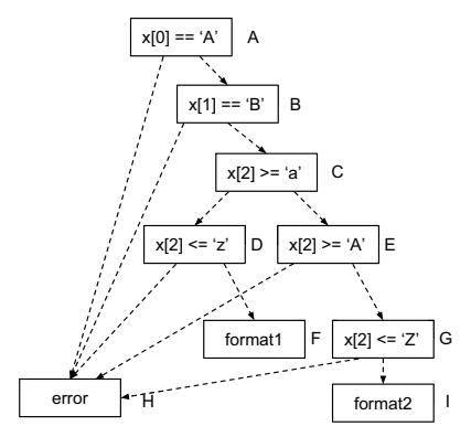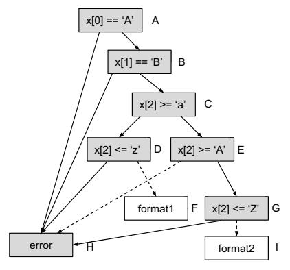 As an example, Figure 1 shows a secure compressed file format: the first 4 bytes are a file header which contains hardcoded magic values ("SECO"); the Keys field declares 95 unique chars whose ASCII values must be within the range of [32, 126]; the Len field specifies the length of the following compressed data; and finally a 4-byte CRC field to integrity check the compressed data. The example is based on CGC KPRCA 00064, extended with a CRC check.