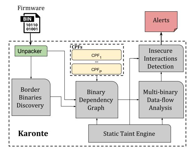 Firmware Pre-processing. KARONTE's input is comprised of a firmware sample (i.e., the entire firmware image). As a first step, KARONTE unpacks the firmware image using the off-the-shelf firmware unpacking utility binwalk [20].