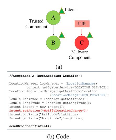 - 2.1.1. Intent Leak Attacks. UIR - As shown in Figure 1 A broadcasts the Intent with sensitive information (i.e., device locations) to B, (Figure 1b), using action ("NotifyLocationChange"). Now by registering to the action ("NotifyLocationChange") the malware component C sniffs the transit Intent from A (shown in Figure 1a), thereby gaining access to the sensitive information.