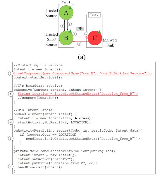 - PE In this case C without location permission indirectly accesses the location data through the benign B (Figure 2b 1 , 2 ). B receives the location information from A (Figure 2b 3 ) and broadcasts it to the C (Figure 2b 4 , 5 ).