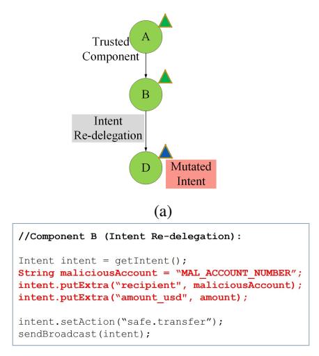 - 2.1.2. Mutation Attack. This is a type of inside attack, where the receiver is a trusted component performing an active attack on the intent by modifying the data consciously or fortuitously and passing to other components further. We demonstrate a similar example in Figure 3a, (1) A receives the following details sender and receiver account numbers, amount, and bank code, (2) B validates the sender and receiver account numbers, bank code, and the amount before initiating sending process, and (3) D processes the money transfer