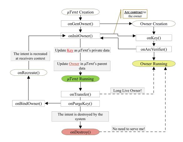 ICC initiates µTent's lifecycle by exchanging µTent across component's. Figure 4 shows various states in the µTent's lifecycle from the creation to the destruction of the µTent.