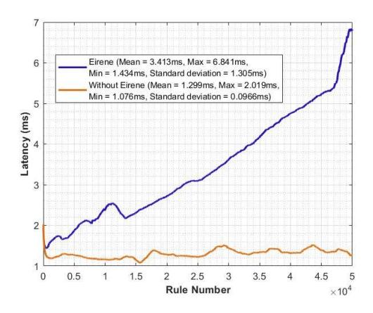 Consider a medium to large scale network with a storage requirement of 100,000 configuration rules. The SDN controllers are horizontally as well as vertically scalable. Thus, the case of 100,000 rules can be catered for by breaking the storage problem into two parts such that there are three separate SDN datastore resources: DR1, DR2, DR3; each with a capacity to store up to 50,000 rules. Assume DR1 and DR2 are storing rules using the Eirene framework (with identical settings). Next, DR3 is used to do comparison of rules stored in DR2 with DR1. Since the worst case comparison is still with 49,999 rules so the one-time worst case delay stays at $\approx 7 \, \mathrm{ms}$ .