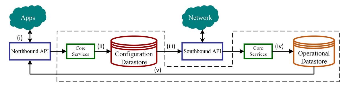 Figure 1: SDN Architecture. (i) An SDN app requests a configuration rule insertion/deletion in/from the configuration datastore via the northbound API. (ii) The request is met using core services in the configuration datastore. (iii) Configuration rules are executed in the network via southbound interface. (iv) The information about network traffic statistics is stored in the operational datastore using core services. (v) SDN apps can read operational statistics from operational datastore via the northbound API.
