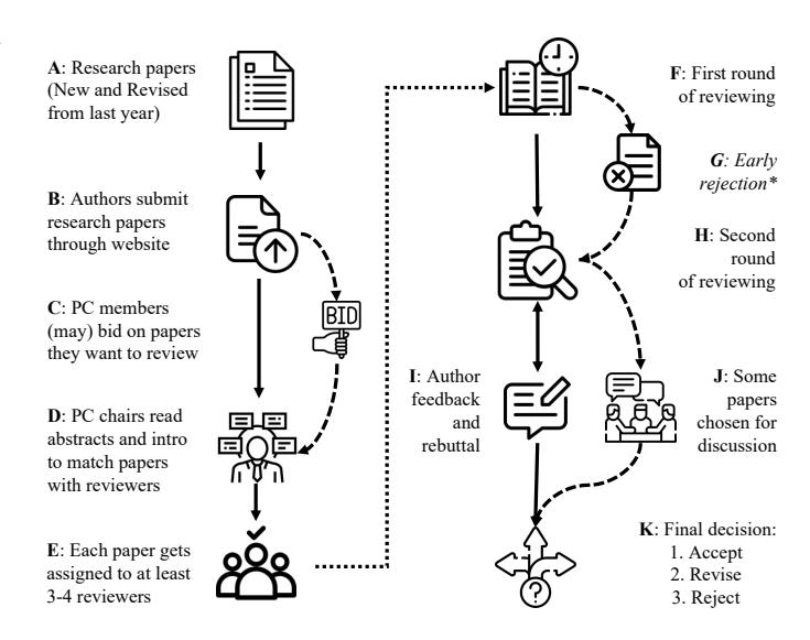 • b) Decision-making process for submitted papers: Three to five PC members typically review a submitted paper (E,F in Figure 1) in a double-blinded fashion: author names are unknown to the reviewers and vice versa. Security conferences typically have two rounds of reviewing, and some conferences may send out early reject notifications (G in Figure 1) after the first round of reviews. Papers that are not rejected in the first round advance to the second round of reviewing, where reviewers review and discuss them (H in Figure 1). Authors of papers that pass the first round may have the option of submitting a rebuttal on the reviewers' initial decision (I in Figure 1). A rebuttal is an opportunity for authors to highlight the importance and significance of their work during the peer review process. Then, the PC, at last, may select a few papers to be discussed extensively via virtual or in-person meetings (J in Figure 1). There is a deadline by which the Program Chairs need to receive the reviews for all the papers. A submitted paper can get a decision in three ways after the second round: accept, reject, or revise (K in Figure 1). An accept means a paper is accepted for publication. A rejected paper cannot be resubmitted to that conference, and the authors must wait for another reviewing year to resubmit. The reviewers may consider some papers as promising but with additional revision work. In that case, the reviewers convey their expectations to the authors, and authors may choose to revise and resubmit their paper by a certain deadline. If the authors satisfactorily