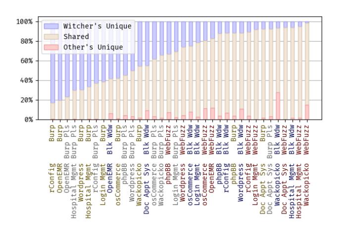 To demonstrate Witcher's advantages over the current state-of-the-art, we perform a multi-faceted evaluation. We compare different configurations of Witcher, enabling and disabling different features to demonstrate the features' efficacy. We evaluate Witcher on 13 web application with known vulnerabilities and five modern web applications with no known vulnerabilities. Overall, Witcher found 90 vulnerabilities in total, 67 of which were previously unknown. We then compare Witcher's code coverage and vulnerability discovery to Burp [5], a commercial black-box web vulnerability scanner, on nine of the PHP web applications. Last, we compare Witcher's code coverage to the recently published black-box vulnerabilty scanner Black Widow [14] and the grey-box scanner WebFuzz [10]. In summary, we make the following contributions: