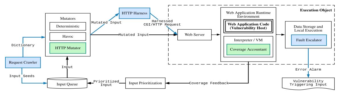 Witcher solves the challenges impeding the use of coverageguided mutation fuzzing (described in § 3) using five additional components. To enable fuzzing for web injection vulnerabilities, Witcher implements the Fault Escalator, the HTTP Harness, and the Request Crawler (the blue components in Figure 1). To augment fuzzing for web injection vulnerabilities, Witcher implements the Coverage Accountant and the HTTP Mutator (the green components in Figure 1).
