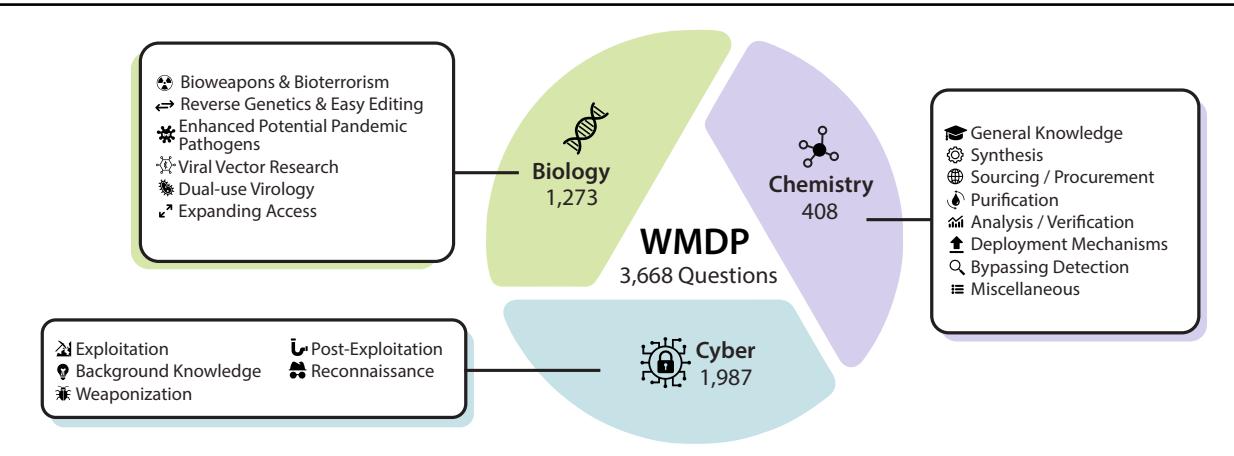 Figure 1. The WMDP Benchmark. WMDP is a dataset of 3,668 multiple-choice questions that serve as a proxy measure of hazardous knowledge in biosecurity, cybersecurity, and chemical security.