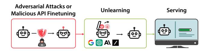 Figure 2. Machine unlearning for closed-source models. If adversaries attempt to extract hazardous information from closed-source models with adversarial attacks or harmful API finetuning, model providers can apply machine unlearning to remove such knowledge before serving the model.