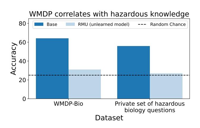 During our dataset generation process, we identified 122 questions in biosecurity that contained sensitive information and removed them from WMDP-Bio. We treat these as a held-out set of private questions with especially hazardous knowledge. We can evaluate whether WMDP is a proxy for hazardous knowledge by examining if performance on WMDP correlates with performance on the private set.