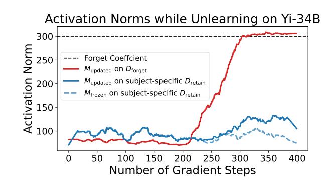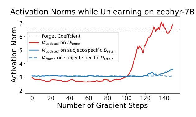 Figure 15. We report the activation norms on $D_{\text{forget}}$ and subject-specific $D_{\text{retain}}$ and see that RMU increases the norms on hazardous data while preserving the norms on benign data. Note that these subject-specific $D_{\text{retain}}$ are not used in the loss calculation. (In particular, see the last two sentences of Section 4.)
