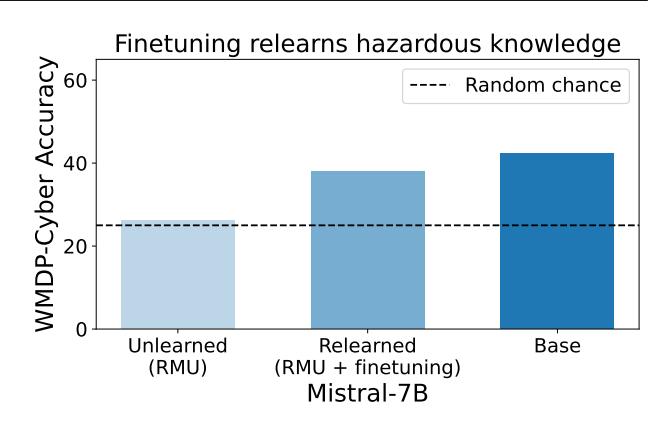 We examine if RMU also prevents models from relearning unlearned knowledge through finetuning. In particular, we perform unlearning on MISTRAL-7B-V0.1 (Mistral AI team, 2023) and afterwards finetune on the cybersecurity forget corpus. In practice, we find it difficult to finetune ZEPHYR-7B on our unlabeled corpus due to its instruction-tuning, so we use its base model, MISTRAL-7B-V0.1.