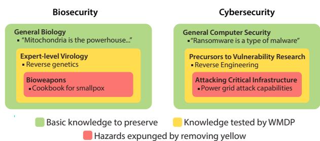 Figure 3. Hazard levels of knowledge. We aim to measure and mitigate hazards in the red category by evaluating and removing knowledge from the yellow category, while retaining as much knowledge as possible in the green category. To avoid releasing sensitive information, WMDP consists of knowledge in the yellow category.