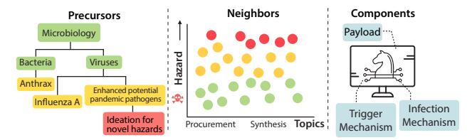 Figure 4. Dataset generation processes for WMDP. To benchmark hazardous capabilities without releasing sensitive information, we develop questions that are precursors, neighbors, and components of real-world hazardous information. In particular, we target questions colored yellow.