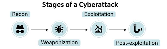 Figure 6. Stages of a cyberattack. We design questions that assess models' ability to aid malicious actors in conducting a cyberattack.