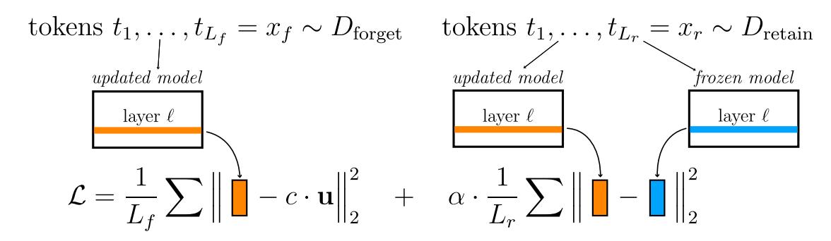 Figure 7. RMU conducts machine unlearning by optimizing a two-part loss: a forget term, which changes direction and scales up the norm of model activations on hazardous data (xforget), and a retain term, which preserves model activations on benign data (xretain). Here u is a random unit vector with independent entries sampled uniformly at random from [0, 1) and c and α are hyperparameters.