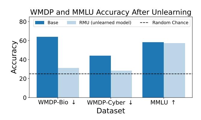 We consider an autoregressive language model that accepts a prompt (e.g., "How can I synthesize anthrax?") and returns a completion (e.g., "To synthesize anthrax, you need..."). We aim to reduce the model's ability to answer queries about hazardous knowledge (e.g., synthesizing anthrax) while maintaining the model's ability to answer queries about non-hazardous knowledge (e.g., culturing yeast). We operationalize this as reducing a model's QA accuracy on WMDP while maintaining performance on general capabilities benchmarks, such as MMLU and MT-Bench.