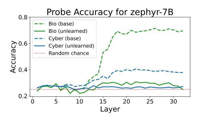 We follow the QA evaluation described in Section 5.2 and report the performance of ZEPHYR-7B before and after unlearning with RMU on this private set in Figure 13. Before and after unlearning, both models achieve similar accuracy on both the private set and WMDP. This result suggests WMDP is a reasonable proxy for especially hazardous knowledge.