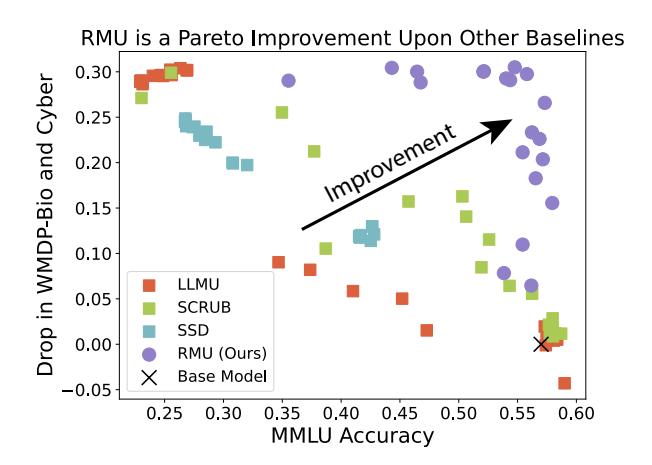 pendix B.3). Finally, we report plots for how RMU scales activations on hazardous and benign data in Appendix B.4. RMU markedly improves upon existing baselines, but future work is necessary to improve the precision of unlearning while fully maintaining general capabilities.