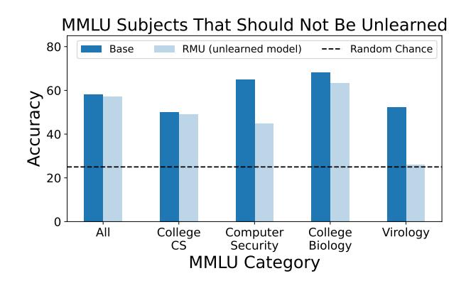 We specifically chose these settings to forget topics that were relatively separate from the remainder of MMLU, and contained a large enough sample size of forget set questions to benchmark on (more than 1,000 questions).