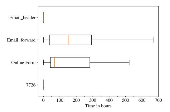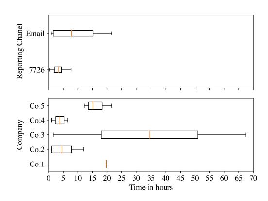 Analysis shows that only five companies sent the reported phishing websites to GSB for blocklisting. Figure 7 shows the blocklisting time of phishing websites in different companies (Co.) and reporting channels in general, excluding outliers of blocklisting times