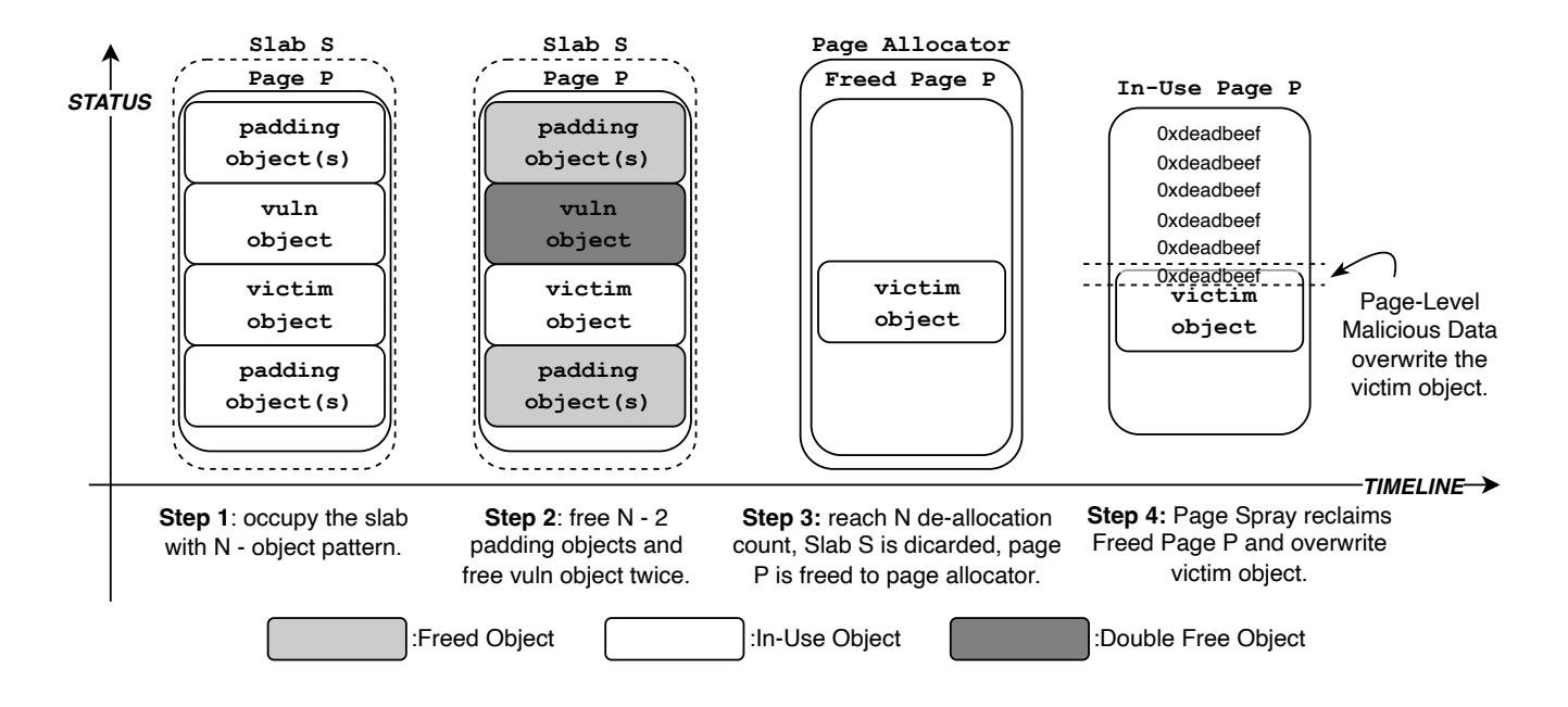 our extensive analysis. We break down the Page Spray technique into four main steps, showing how it operates during the exploitation of kernel heap vulnerabilities. Furthermore, we showcase the versatility of Page Spray by demonstrating its applicability to different types of vulnerabilities.