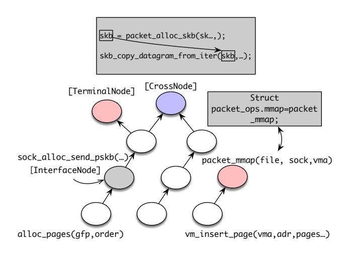 Remapping Analysis. When it comes to analyze remapping callsites, it is worth to emphasize that the biggest difference compared to copy-write callsites is that the allocation chains and remapping chains probably don't have an intersection, which require more detailed dataflow analysis. First, we also build invocation chain for remapping(mmap) from root interfaces. In the following step, we search from the lowest level page allocation function with a BFS queue, to find if a potential page allocation can be invoked in the corresponding remapping's subsystem. Once we successfully find an upper root interface in subsystem, we mark it as potential allocation root interface for previous remapping chain. After that, we perform backward dataflow analysis to remapping point, the goal of it is to find a potential control structure for remapping behaviors in related subsystem. Correspondingly, to find out the control structure for allocation, we execute forward dataflow analysis. By integrating the results from the previous dataflow analysis. We are able to have a allocation control structure and remapping control structure. At last, we apply a nest-analysis for two structure to figure out whether one of the control structures is a childfield of another control structure. We confirm as valid remapping point when they have the same control structure in the same subsystem, or the two control structures have a parent-child relationship in the same subsystem.